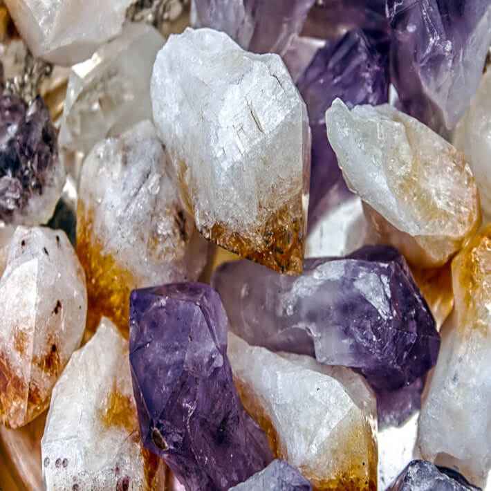 O Ametrino, como seu nome sugere, é a união entre Ametista e Citrino. Possui excelente propriedades para fortalecer o sistema imunológico. Essa pedra combina as qualidades daquelas que lhe deram origem para ajudar a dissipar negatividades, toxinas corporais e a fadiga.